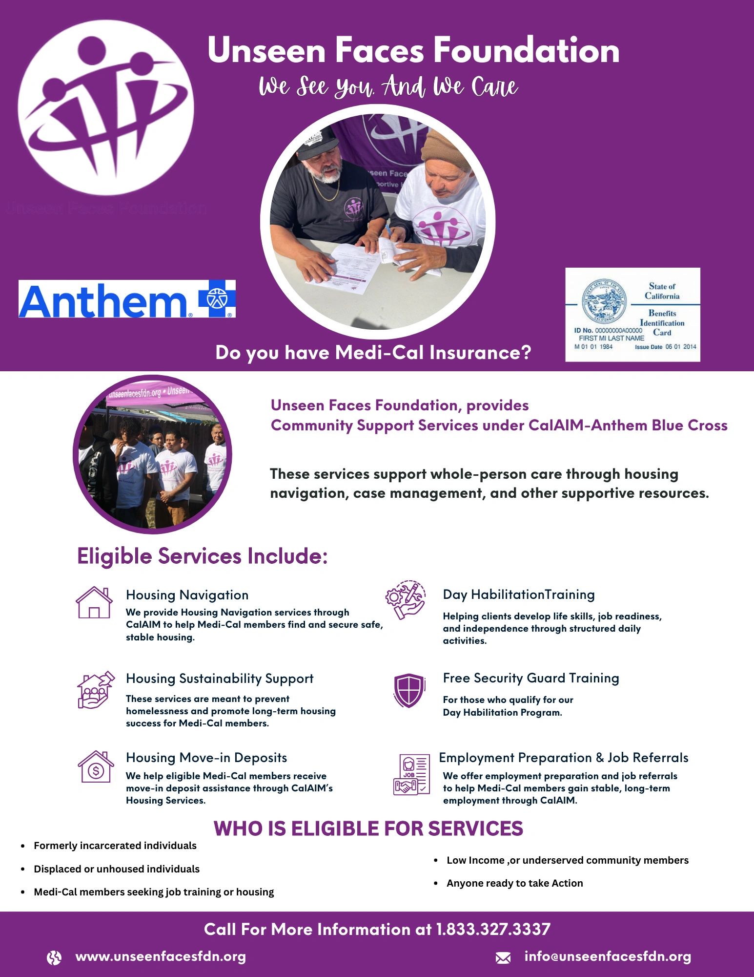Recognizing a crucial need in the community where individuals were missing vital doctor's appointments due to transportation challenges, Unseen Faces Foundation has incorporated a non-emergency transportation service into our mission. For those with medical coverage, transportation expenses can be covered, and we also provide free transportation for specific rides within a designated radius to ensure individuals can access their essential doctor's appointments without financial barriers.